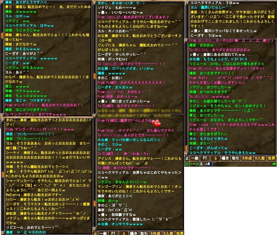 ついに転生 完美世界 2009年03月14日 ようやく13日,89になりました.最後の1レベルはかなり怒涛で,今までにないハイペースでした.たまには一生懸命でもいいよね>x<89目前キューブ.Σ(`д`ノ)ノええぇ,ちっこ!89転生クエスト掘り.おおおおお,初めて来たぞこんなとこ!ずいぶんキラキラ宝石がイッパイ( ´艸`)前にお手伝いした掘り掘りの砲台MOBとは別のサソリもいて,ソロは困難といわれつつもやってみたくてつっこんだところ,あえなくチン・・・起こしにきてもらったココさんまでチン・・・あぅあぅ・゚・(ノД`)・゚・リザもらって起きるけれど,無敵時間の後の砲台MOBの攻撃痛すぎて上昇逃げの間にも大量にくらい死にまくりました…w結局きのっぴに助けてもらって,なんとか無事に・・・と,思いきやじさまもキーミスで落下してチン・・・!いやぁー,波乱万丈な掘りクエでした(*ノд`*)あとは89天に乗り込むのみ,というところで,お願いしていた面子の集合時間まで,ペアクエでもしようということに.前に湊で行ったところ,圧倒的に足りない男性陣からお相手が見つけられず断念したという経緯があったので,今回はむじくんで. 運よくきのっぴと組んでもらうことができ,スイスイ進んでクリア!クリアごとにポアポア出る花がなんとも( ´艸`)♪ついにきた89天!!ブラフマ直前までスイスイだったのに,ブラフマのザコ大量釣りで大変なことに…!!やっぱり,カオスなるのね(*ノд`*)いぁまぁ,チンしたのが私だけでよかったよ>x< いよいよ掘りです.ざくざく・・・周りでぴょいんぴょいんとはねる人たち・・・w戻ったら,たくさんの方々が出迎えてくれました!。・ ゚・。* 。 +゚。・.。* ゚ + 。・゚・(ノД`)感謝感謝 そして,たくさんの世界茶とササを頂きました・・・!皆様本当にありがとうございます!!!途中からパニクって,もらったササにお返しできていないのが多々・・・せっかく送ってくださったのにすみませんでした○rzこの場でもういちど.ありがとうございました~~~!!!さっそく魔界へ. すごいところだ~~~!とりあえずスキル覚えよう!魔閃!!スピードアップ!!!そしてきのっぴにお祝いとしていただいたルーイン覚えた!きのっぴありがとう。・ ゚・。* 。 +゚。・.。* ゚ + 。・゚・(ノД`)ウフフ,スピドアップで7.3mで走れるようになった( ´艸`)♪弓スキルで8.1にウキャキャはやくビーストモード覚えたいな~とりあえず,トナカイで走るより飛ぶほうが速くなった気がします.くりぽが楽になるだ!♪(*´Д`*)カワイイきのこちゃん. これからよろしくね~♪♪いやー,本当に長かった.約一年半かかりましたが,飽きっぽい私が転生できました.ここまでこれたのも皆様のおかげです.ありがとうございます.これからもどうぞ,よろしくお願いします・・・!! [0回]PR