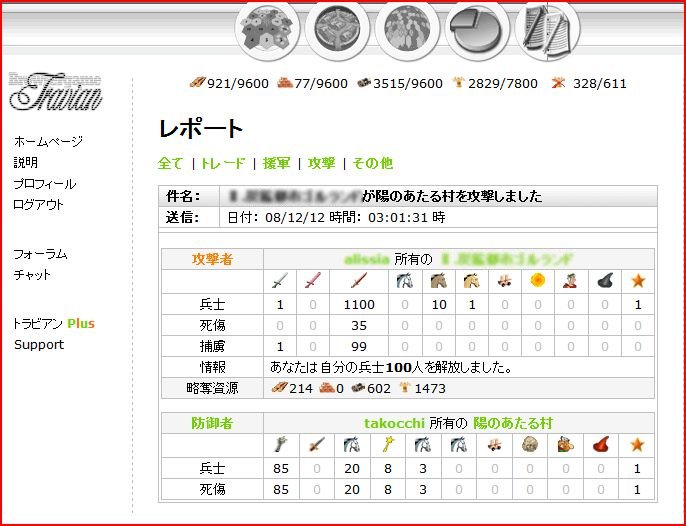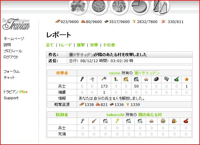 travian その他 2008年12月12日 誘われて始めたtravian.AOCとかチョコット遊んでたから,おもしろそうと思って始めたんだけど.めちゃくちゃ攻めてこられて,とても殺伐としているゲームだよって,そう聞かされていたけど,最初は誰も攻めてこなくて.のんびり内政やって,適度に兵士作って,シムシティ楽しんでたら.突如嵐が…!2,3日前から偵察に来ていたこの方々,スパイはすべて撃退していたのですが.業を煮やしたか,一気に攻めてこられました.ちょw 1100人てナニwwwwwそして間をおかず第二波.資源ごっそり(ってほどもともとないけど)もってかれました.今日の午前に罠を作り直し,スパイだけ作り直すも,昼すぎに攻めてきた別のとこにより全滅…ラムとかきてるし.建物1つ壊れたし…始めて三ヶ月ほどたちましたが,心折れそうですヽ(`Д´)ノ強い同盟入ってないと一人じゃまともにゲームもできないとか,大して交流もてるような仕組み無いのに難しすぎるよ… [0回]PR