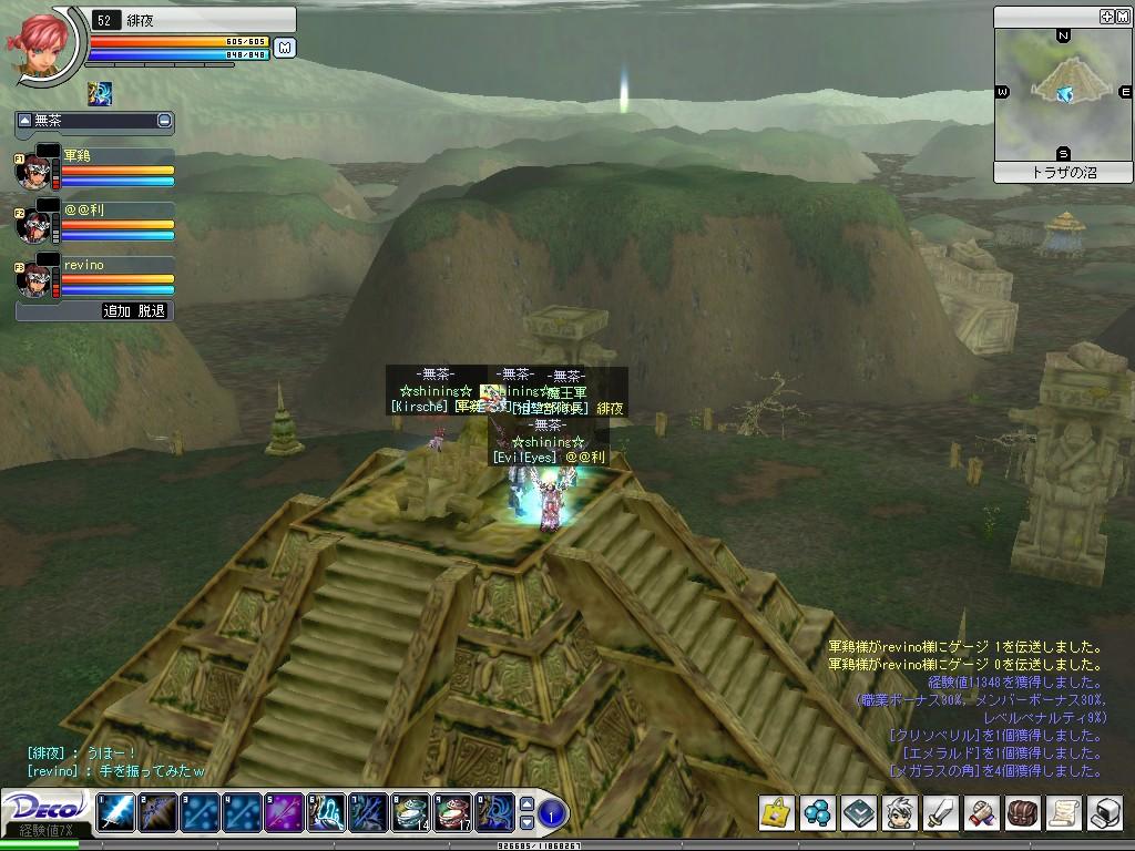 石稼ぎ Deco Online 2006年06月03日 インしたら速攻で澪姫さんに拉致られたw沼に行って石稼ぎ。でもすぐに澪さんはPT抜けていかれました。ちょと残念(TwT。)今日はあの強敵63のでかモンスにチャレンジ!メンバーは軍鶏さん、revinoさん、@@利さんのshining組。考えてみたら全部の職がそろってたんだw@@利さんがタゲ収集、軍鶏さんがゲージため、revinoさんがスキル、で、私がヒール。とまあ見事に役割分担をこなして難なくクリア♪♪…なわけはなく。なぜか軍鶏さんにタゲがうつり、クリ一撃で即死。あとに残されたメンバで必死の攻撃、私もゲージためにまわりました。結構な時間がかかってやっと全滅。いやぁー、制覇した後の頂上は気持ちがいい!思わずさけんでしまいましたwむこうのほうで光っているのが沼の入り口です。この後は皆でハリセン・魚・指差し棒w楽しかった^^このターンを2回ほど繰り返して今日のPTは終了。軍鶏さん、revinoさん、@@利さん、澪姫さん、PTありがとうございました!ハクに帰ってきたらわるねこの方に話しかけられました!このブログを見てくださっているとのこと。僻地な場所を訪れてくださっていて、本当に感謝です。うれしくてつい長々とお話していたら、続々わるねこの方たちが集合されまして。いっきにその場の平均レベルが上昇しました。すごいなぁ。70とか夢だわぁ。いつも遠目でかっこいいなぁと思っていた方々とお話できて、とても楽しい時間でした。わるねこのみなさん、お話ありがとうございました!その後櫻愁でギルメンのレベル引き上げ。と思いきや、インされていたリョウガさんを拉致して伐採に。櫻愁のレベルは当然足らず、結局私も引き上げてもらう側に・゚・(ノД`;)・゚・おかげでレベルが上がりました。リョウガさん、影守さん、PTありがとうございましたー!その間にポイント散在。櫻愁です。黒髪・蒼目にしてみました。あーぁ、なんてこったいw以下、おへんじです~ つづきはこちら [0回]