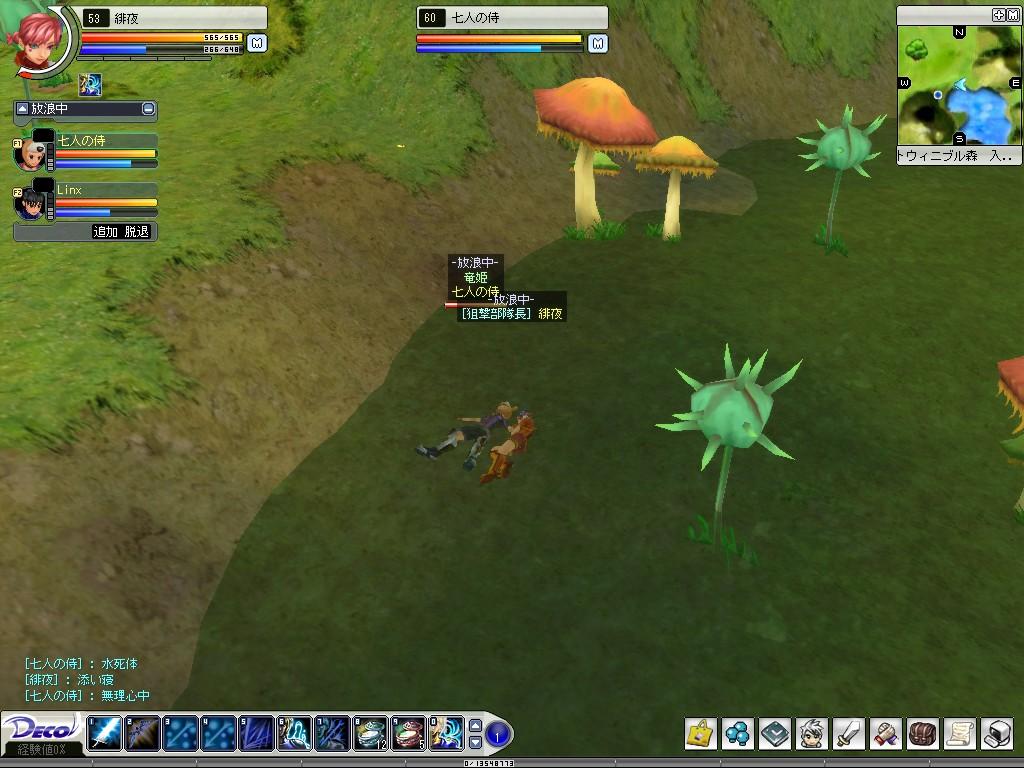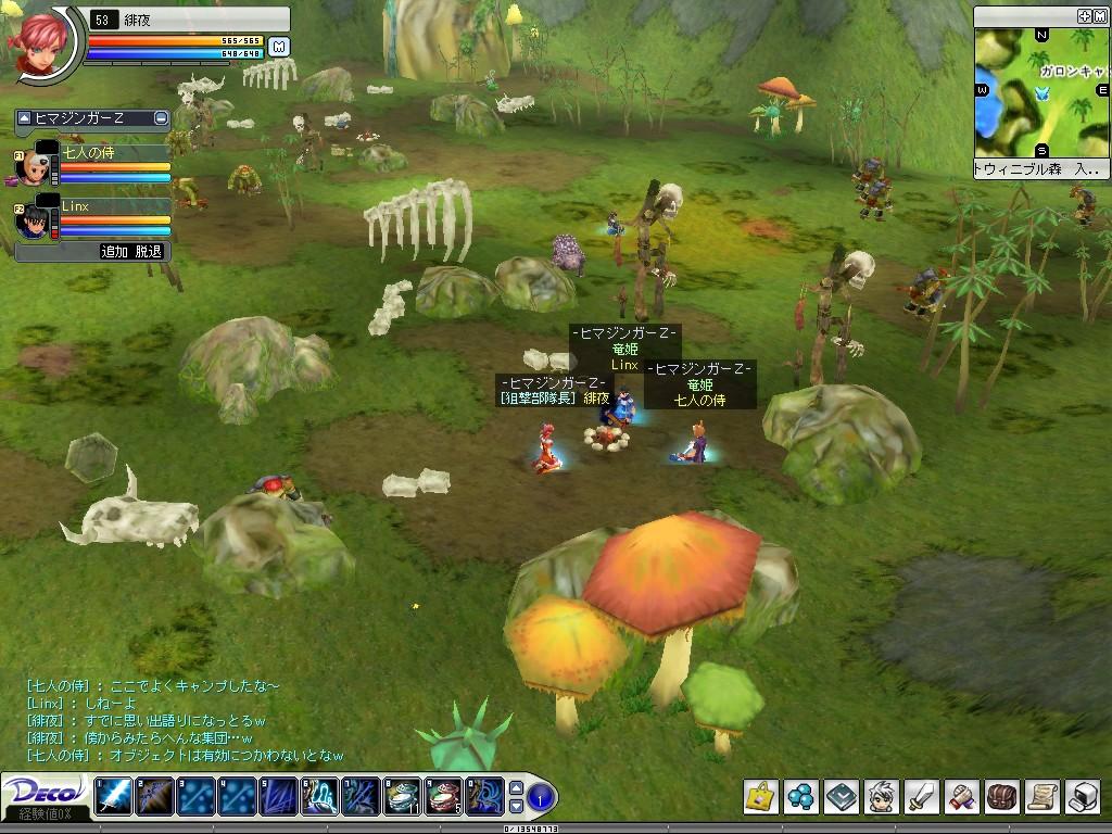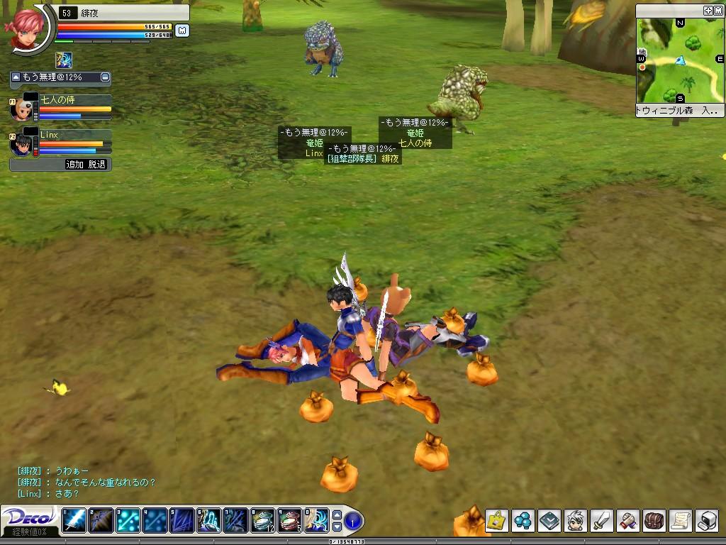竜姫ギルド Deco Online 2006年06月04日 今日はLinxさんと伐採から始まり、竜姫ギルドのPTに合流させていただいて、海でメガラス退治の補助をしました。MAXPTを上回る人数となったので、リーグに変更。あたしだけ異色の魔王軍。ギルド関係なく遊んでもらえて、とっても楽しかったです。おかげで早くも今日レベルUP!わぁーい♪♪ここで狩りPTは終了。レベル上がりたてなのでハリセンでメガラスどついてみました。侍さんはピコハンで倒してたしw難破船の裏にひそむよく分からん鳥にちょっかいだしたら、5、6発で逝きました。でもペナがないから痛くない♪♪久しぶりに森に行きました。ハリセンでキラガスに突っ込みを入れてみる。周りの新人さんにはさぞ迷惑だったでしょう^^;瀕死な13歳や18歳にヒールを入れて、「がんばれ~」とエール。辻ヒールの醍醐味です。もうあたしは53のオバさんです。森の中をうろうろしながらちょくちょく狩ってすわってしゃべって。うだうだしながらSS撮りました。 三人で重なってみる。 池に沈んでみる。 キャンプしてみる。はー楽しかったw狩るばっかりじゃなくて、こんな凸もいいですよね♪竜姫ギルドのみなさん、PTありがとうございましたー [0回]