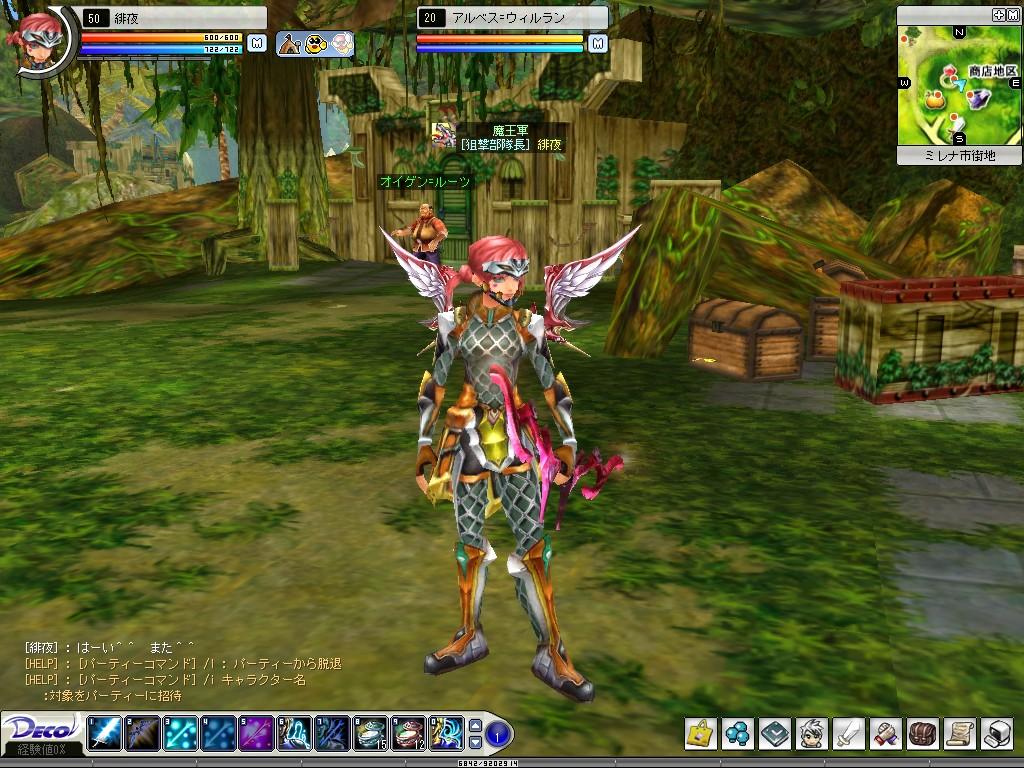 クロセル苦労せる(ぁ Deco Online 2006年05月29日 今日はギルドバグなおっていました。よかった。お昼に入ったらトラさんと詠ちゃんがいたので、詠ちゃんのLV上げついでに自分も上げようと、伐採をしました。詠ちゃん上がり、トラさんもあがったところで、私は@4%ほど。おふたりはごきんじょ冒険隊の新メンバーを迎えにいくとのことで、私は残りをあげてから合流するというわがまま手段にでてしまいました。でも… よしゃ、あと2匹くらいでLvUPだっ!と思ったところでたぶんゲージ死。うぅ、バチがあったんだわ。それでも悔しくて木52と53を相手取り、なんとかLvUP!やっと50の大台に乗れました。ふぅ。そのあと櫻愁にチェンジしてごきんじょ支援。ずっと弓で支援側だった分、スレでレベル引き上げお手伝いというのは不慣れで、どうすればいいのかあたふたして、ギルメンの方には大変ご迷惑をおかけしました。うーん、あたしには『率先』という言葉が似合わないヾ(_ _。)疲れたので休憩。スパークリングタイム(?)にあわせて再びイン。軍鶏さんレヴィさん@@利さん澪姫さんJulianaさんとMAXPT。適宜メンバが入れ替わり、ヴァイスさんがこんにちは。クロセル相手にざくざく狩ってたのですが、ヤツラのアクティブゾーン広すぎる;;どこにいてもひっかけてしまい、おたおたしている間にレヴィさんは何度も逝かれてしまい(TwT。)みなさんご飯でPTは解散。残ったレヴィさんと伐採へ。そばにいたアリスさんという方ともご一緒して赤やら白やらを狩りました。帰ってきた@@利さんも合流。今日は早めに終了。明日早いしね。私は@17%。自力で上げられるかと思ったけど、30分かかって3%だったので断念。お着替えしました。…うーん、カーリーさんが鱗、澪姫さんがメロンっていったのがよくわかるw45装備は胸が見えてるなぁと思っていたけど、50装備になってすごくゴツくなったwまた55装備は派手にもどるし…つくづく、装備って不思議だなぁと思います。以下、おへんじ~ つづきはこちら [0回]