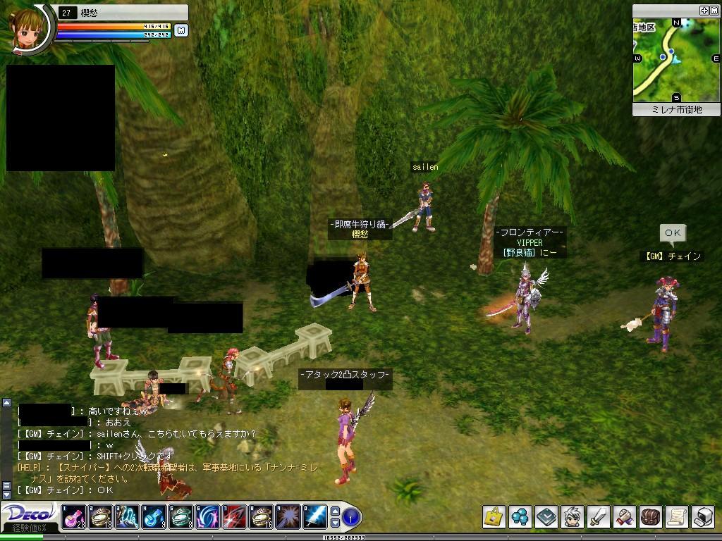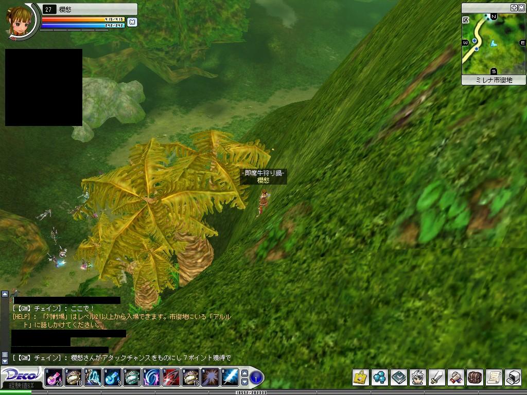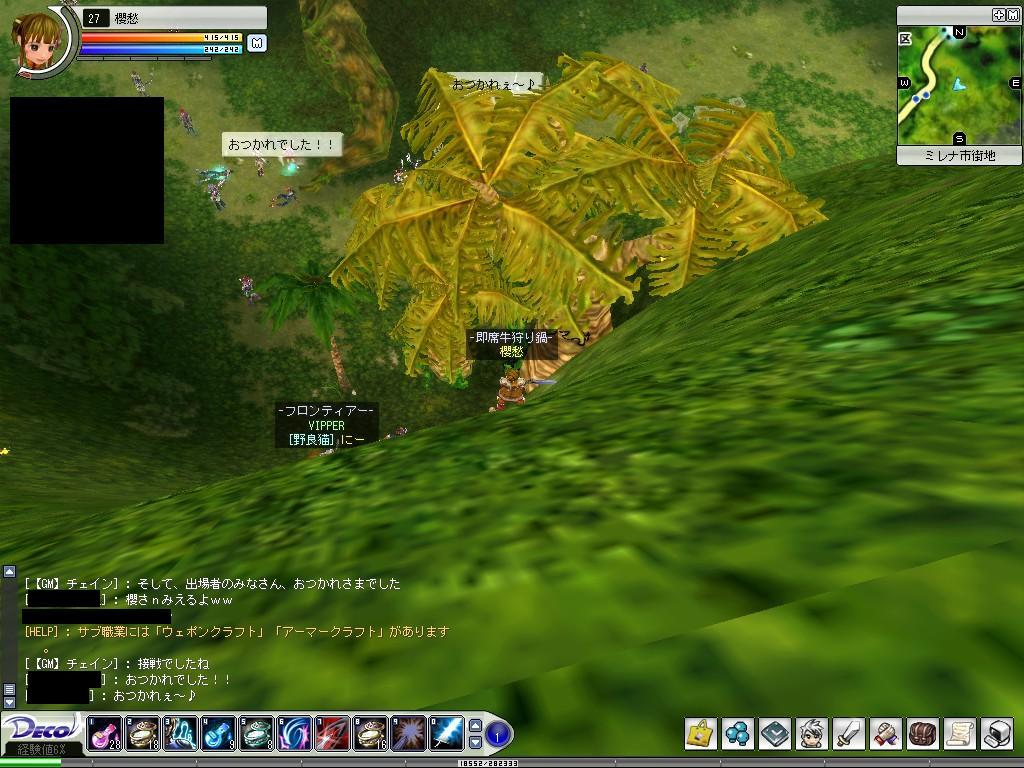クイズ王になっちまったw Deco Online 2006年05月14日 今日は櫻愁のレベルを上げようと、はじめから櫻愁でイン。あやむしとレヴィーノさんがPT組んでいるところに混ぜてもらい、一緒に狩って75%くらいだったところからレベルアップ♪そのあとすぐにあやむしはログオフしてしまい、とりあえずいったん狩りはひと段落。そういえば今日はクイズイベントの日だっけ、どうしようかな、櫻愁が所属予定のギルドのために30にはなっておきたいな、と思っていたけど、レヴィーノさんに誘われて結局行ってみることに。イベント自体が15分ほど遅れていて、2chへ移動したときにちょうどよくイベント開始。最初の○×クイズは雑学問題と凸関連で全8問だったかな。最後の“デコポンの命名は細川元首相である”っていう問題にやられて負けたものの、正解者が二名だったことで敗者復活戦に参加!二回戦、敗者復活戦はエルド文字問題。GMチェインさんがぽとぽとエルドを落としていくのをみながら、なんだろうなぁとぼんやりみていたら、だんだんケータイの電波マークにみえてきた。最初に『電波!』ってささやいたら、「惜しい、具体的に!」とチェインさんが言い、誰の答えについてかなぁと思いつつ、『ケータイの電波マーク!』と叫んだら見事大当たりっ!やったぁ!!ってかぜんぜん凸に関係ない…縦に並べるのはたしかにわかりやすいですよね。かくして櫻愁は敗者からのしあがり、3人目の↑↓早押しクイズメンバーに。最初の参加理由からしてホントはあたしここにいるべきじゃないよ…なんてあせりながら選手の列へ。↑↓クイズはシビアだった…;;凸に関することと、雑学の入り混じった問題で、雑学は多少対応できるものの、凸のことなんて…汗 『凸小説の父親の名前は?』っていう質問に誰一人答えられなかったのが凸小説の知名度を知らしめましたね(コラここまできたら負けてられるかっと、元来の底意地の悪さがでまして…1問正答で1ポイント、7ポイント先取のこのクイズを着々とこなし、4問正解ときたところでチェインさんからアタック問題との指示。どうやら4問正解したらその後は1問2ポイントになるらしい。6ポイントに達して次点と3ポイント差でむかえたラスト問題。『スリランカの首都は?』キターーーー!!! これあたし無駄に覚えたよーwグレートブリテンおよびアイルランド連合王国なんてイギリスの正式名称と一緒におぼえた結構どうでもいい名前だよねーーー!!!速攻で「フロンティアー!」 A.スリジャヤワルダナプラコッテ。かくして櫻愁は初代クイズ王?になりました。商品は、HP・SP共に一度で300上がるポーション60こ。やったぁ♪と喜んだのもつかの間。…をい、これはLv30から使えるやつじゃないかっ!笑 そのときの櫻愁のレベルは27。チェインさんに「がんばってください」といわれw …あぃ、がんばらさせていただきますw 左側が↑↓クイズがスタートしたとき。はやくもsailenさんが1問クリアでおくの山の一段たかいところにはりつけられています。右側が4問クリアした私。こうやって山の壁にはりつけられ、一歩もうごけずw画面いっぱい緑がひろがっております。 左側7ポイント先取して一番になったときの私の視点。高い!かろうじでカメラを回して下が見える程度。途中でGMジルさんが現れたらしいけど、確認できず。右側が同時期の別視点。こんなんだったのよ~とっても楽しいクイズイベントでした。狩りなんかに行ってなくてよかったwひとつ残念だったのは櫻愁で行ったこと。。いや、ウチの子ですから残念ってのはアレですが、メインで行けばよかったなぁと。。そしたらブログの宣伝にもなった?w 何はともあれ、参加者のみなさんありがとうございました。その後レヴィーノさんと牛狩り。周りにいた新生魔王軍カカオOZさんと竜姫のナイトさん(名前OKもらいそびれた;)を拉致して4人でPT狩り。ここでもレベルアップ!今日は通算2レベルもあがりました♪レヴィーノさん、カカオさん、ナイトさん、PTありがとうございました♪気力ポーションも切れてきたのでいったん市街地へ。石売りの出店がでていたので覘いたら藍4がっ!20万でしたが、ふたつ買いました。弓でPTするときは藍の防具がひとつでもあるととても助かります。大事に使おう♪以下、おへんじが続きます。 つづき… [0回]PR