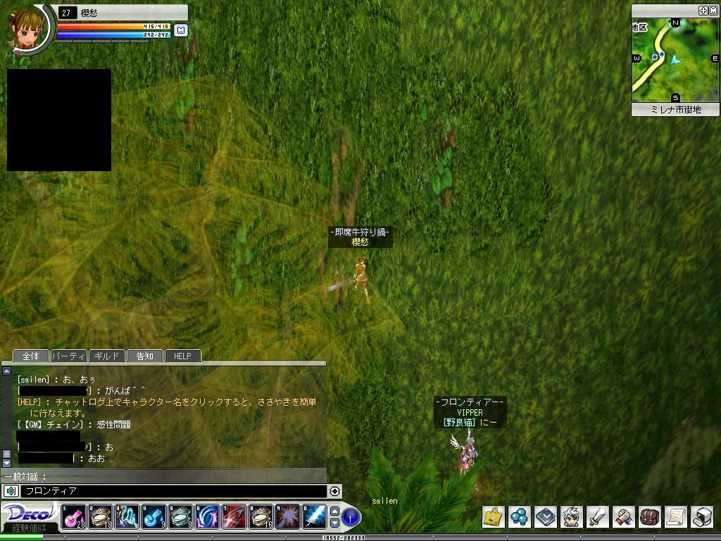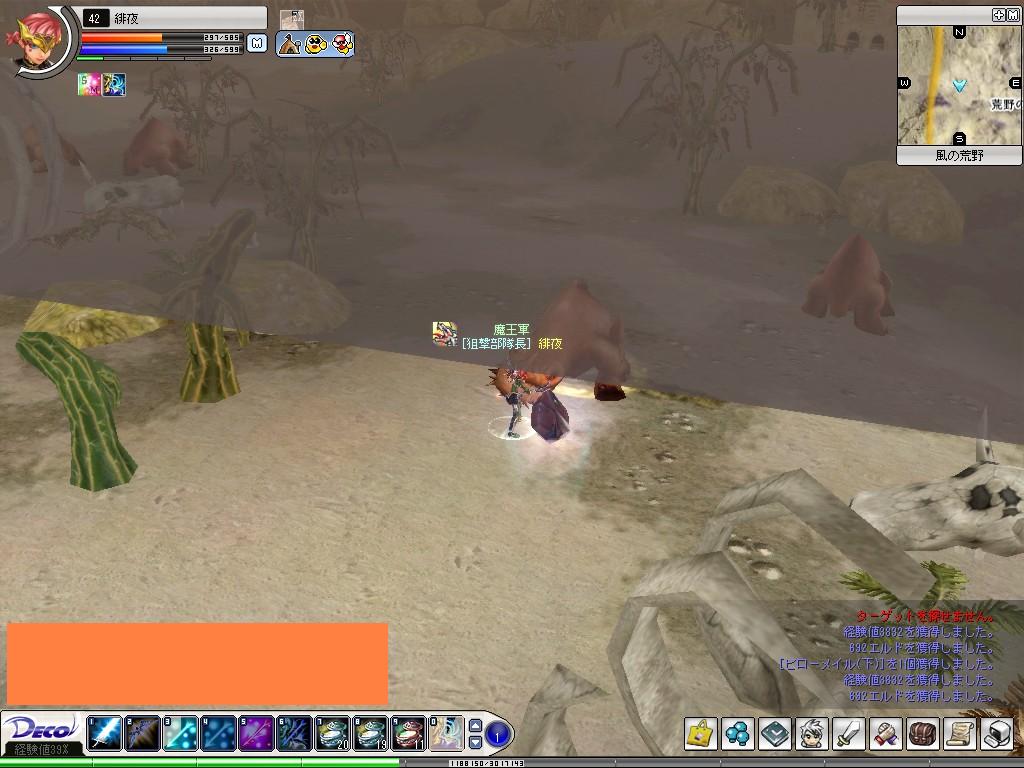 カバ狩ってカバ狩って Deco Online 2006年05月11日 今日は経験書二時間20%↑を使ってみました。ソロでカバ♂44にて3100の経験値が、3800ほどに。塵も積もれば山となる、やはり多少は早くたまりますね。それで二時間ソロ狩りの後、TORACHANさん、あやむしさんが入ってこられてPTにて牛を少し。三人ならカバだっ!ということで途中からカバに行き、♂44と46を中心に狩り。あやむしはPTで今日レベルが2も上がる快挙。やったねっ♪私もあやむしとTORACHANさんのゲージ転送→狙い撃ちで一匹にかかる時間が大幅に減少し、とても効率のいい狩りができました。おかげで今日もレベルUP♪TORACHANさん、あやむしさん、PTありがとうございました。今日の一枚。インしてまもなくのとき、前方から透過性のある茶色のカーテンが下りましたw倒したカバがカーテンにはさまっているみたい笑 [0回]