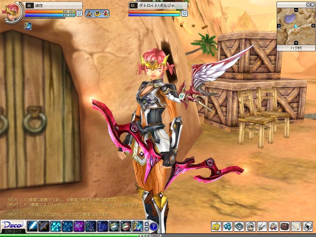 衣替え♪ Deco Online 2006年05月13日 今日はちょっと遅くなって23時ごろのイン。ハク村から入ると、なんとすぐそばに軍鶏さんがっ!ほどなくrevinoさんがハク村にいらさり、またshinigのほかのギルメンの方に混ざってPTを組んでいただきました。・・・して、今日も伐採。現地に行くと高レベルでよくみかける方たちが猛然と伐採されていて、私たちのPTは場所を移して伐採開始。ほどなくしてヴァイスクルーゼさんという方が合流。どうも、はじめまして!また、もう一人弓職の方(名前OKもらいそびれた;)もPTに入り、5人でクロセルにチャレンジ。前線の方はクリティカルを連続3回など受けて倒れながらもあちこちにわくクロセルに挑んでいかれました。すみません、ヒールしかできなくて…コンボ速度上昇のスキルをはさもうなんて余計なことをしていたらすぐゲージは減るし、そうでなくても今日はヒール矢の調子がイマイチだったので。。revinoさんがレベルアップ、つづいて私もレベルアップ!!うわぁぁあん、バファ○ンならぬ緋夜の半分は皆様の優しさでできていますっ!!!…いやむしろ半分以上…感謝なしで私の凸は語れません。軍鶏さん、revinoさん、ヴァイスクルーゼさん、弓職さん、PTありがとうございました。レベル45になったので新しくスキルを取得♪コンボゲージがひとつ増えました★☆そして待望の装備変更!やったぁ♪変更できるということがうれしくてポロッと口に出したら、軍鶏さんが強化をしてくれるというなんとも優しいことを言ってくださりまして。その言葉にすっかり甘えてしまい、装備を作っていただくことに。45装備、上下+3と袖靴+2に薄緑3をつけていただきました。本当にお世話になましたっ!!その間、私は45+2の弓を+4にすべく奮闘…今日の幸運は8、さていかに…と、+3はノーマルでいくのですが、+4をしようと思うとヘルに…orz+3を二回ダメにしたところで素材もなくなり、力尽きて+4はあきらめ、3回目にできた+3弓に赤石3をつけてしまいました。もう少し頑張りたかったけど、とりあえず+3はできたのでよしとします!今日の一枚。衆人環視の中、堂々と生着替えを決行ww弓も変えて新たなモンスへの対応はばっちりです。でもなんでシャッターチャンスを逃すかなぁ。眼、オッドアイなのですよ~以下、お返事が続きます。 つづき… [0回]